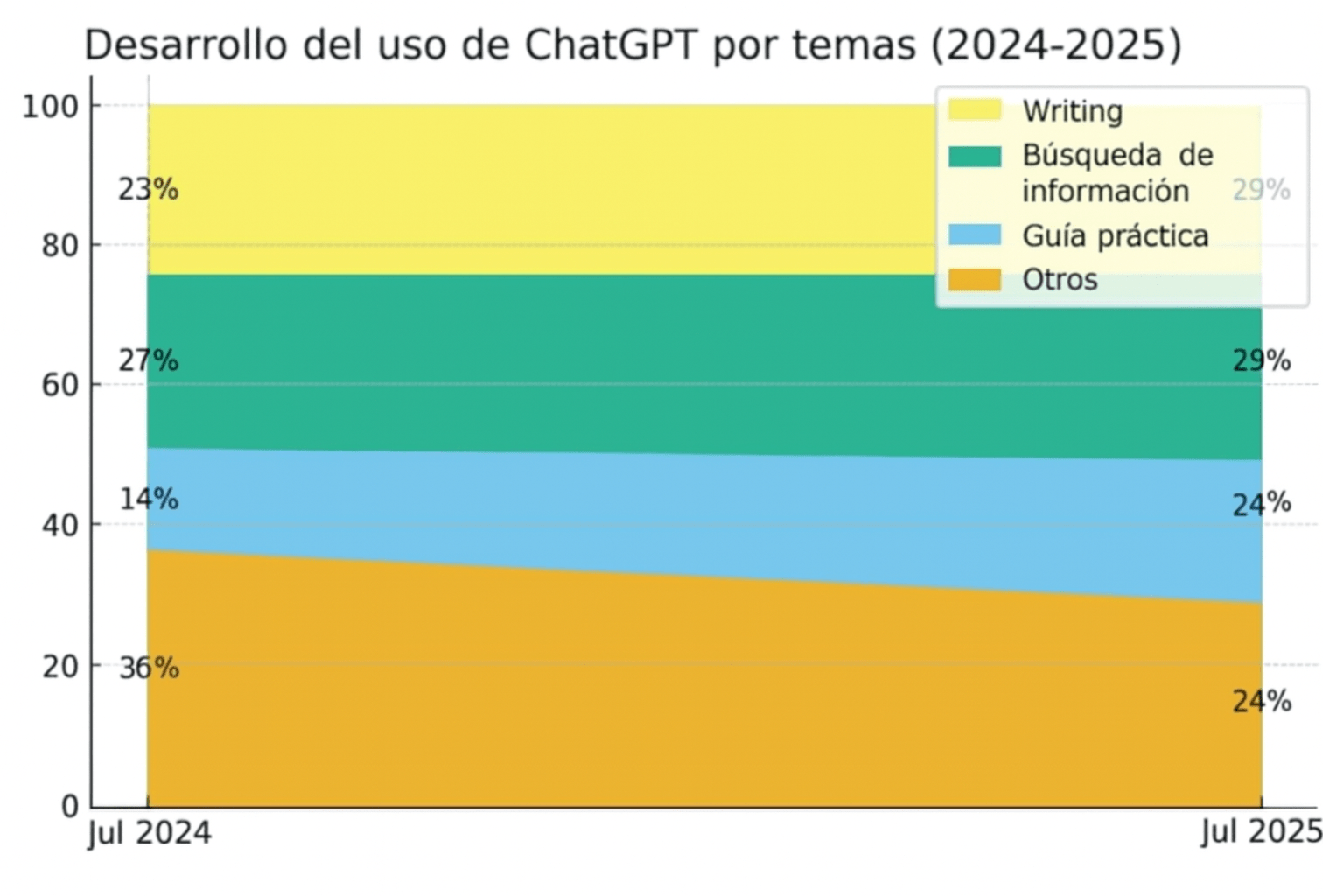 ¿Qué temas predominan? El estudio clasifica cada mensaje según su enfoque de contenido. Lo que está claro es que los tres principales (guía práctica, búsqueda de información y writing) representan casi el 80 % del uso total.