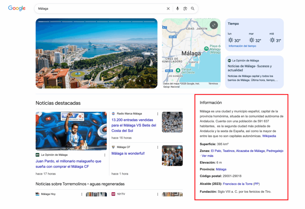 • Cuadros de conocimiento: son los recuadros grandes que aparecen a la derecha de los resultados de búsqueda, con datos sobre personas, empresas o lugares. Se nutren de fuentes fiables como Wikipedia o directorios oficiales.