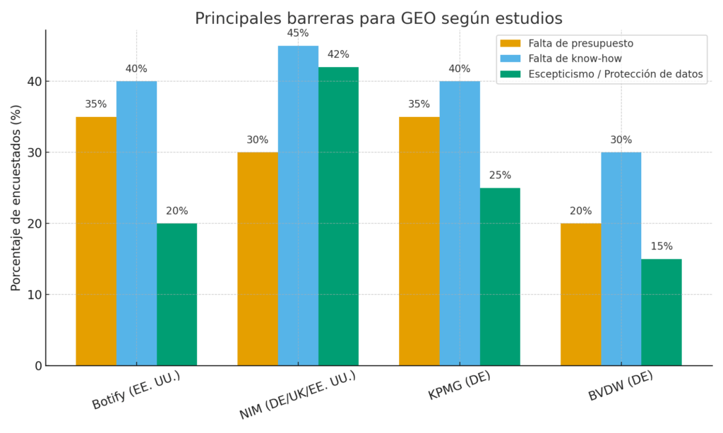 De la comparación entre estudios se desprende un patrón claro: las empresas se encuentran con los mismos obstáculos a la hora de introducir GEO y la IA generativa.