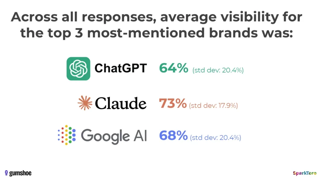 Aunque el orden de las recomendaciones cambie constantemente, existe un núcleo estable: las marcas fuertes aparecen en entre el 60 % y el 90 % de todas las respuestas, independientemente de su posición. Esta frecuencia de aparición o share of voice (cuota de visibilidad) se convierte en la métrica clave dentro del GEO (Generative Engine Optimization).