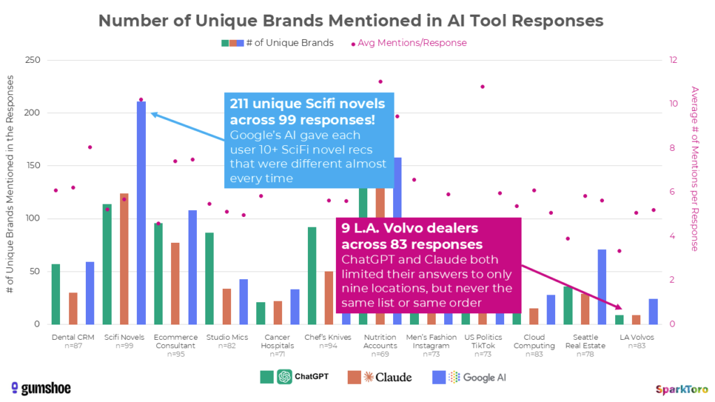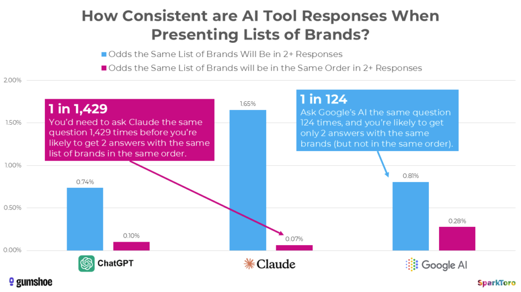 Un estudio reciente de SparkToro y Gumshoe muestra una sorprendente inestabilidad en el mundo de las respuestas generadas por IA. Si se pide a una IA una lista de recomendaciones de productos, la probabilidad de que devuelva exactamente la misma lista dos veces es inferior al 1 %. Si se trata del orden exacto de las menciones, la probabilidad se reduce incluso a 1 entre 1.000.